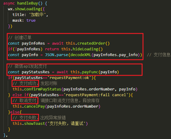 前端小程序api做好不同情况处理,点击取消点击确定,异常等 - 支付完成对账,由订单号、商品名、支付信息